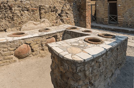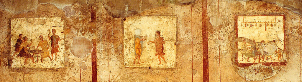 When we think of eating in ancient Rome, we tend to think of the triclinium, the fancy form of dining room that Hollywood so loves to display, in which three beds are placed surrounding three of four sides of a central table, where host family and guests recline to eat from the banquet on the center table while slaves prepare and serve food. Perhaps intuitively of course, this form of dining was not something that most Romans did and was a way for the wealthy to display prestige to one another. It is represented so frequently in large part because the opulence of the upper class of Roman society has become such a media staple and this same class is the one which primarily produced our most influential historical records. This raises the question: how did communal eating happen among other portions of the Roman populace? Today, we will be looking at the urban lower and middle classes of first few centuries AD in the core of the Roman Empire, primarily Italy. It’s important to realize that yet other conditions would have existed in the rural areas as well as across the culturally diverse communities from Britannia to Arabia. The writers we will be using as sources use primarily Latin (distinguishing them from those more local to the Hellenized east) and the archaeology we will use as reference points comes primarily from Italy, especially Pompeii and Herculaneum, located in modern Naples and destroyed (but also thus archaeologically preserved) by the eruption of Mount Vesuvius in 79 AD.