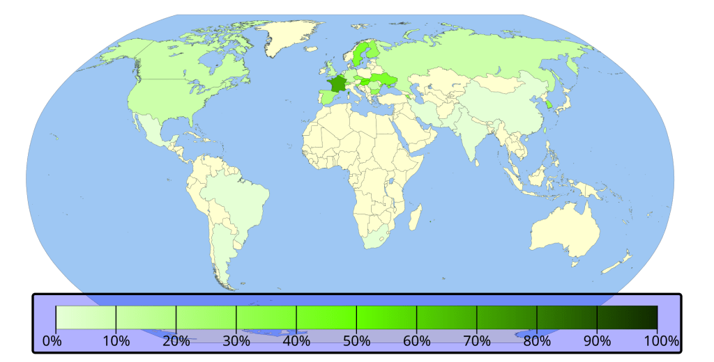 Map of countries color-coded by the percentage of their electricity grid which is produced by nuclear power as of 2023 data. Only two countries, France (64.8%) and Slovakia (61.3%), produce more than 50% of their electricity grid by nuclear power. Due to the expensive infrastructural limitations, nuclear power is an inaccessible luxury to most of the world’s least developed countries. Graphic by Wikimedia user NuclearVacuum with data from the International Atomic Energy Agency.